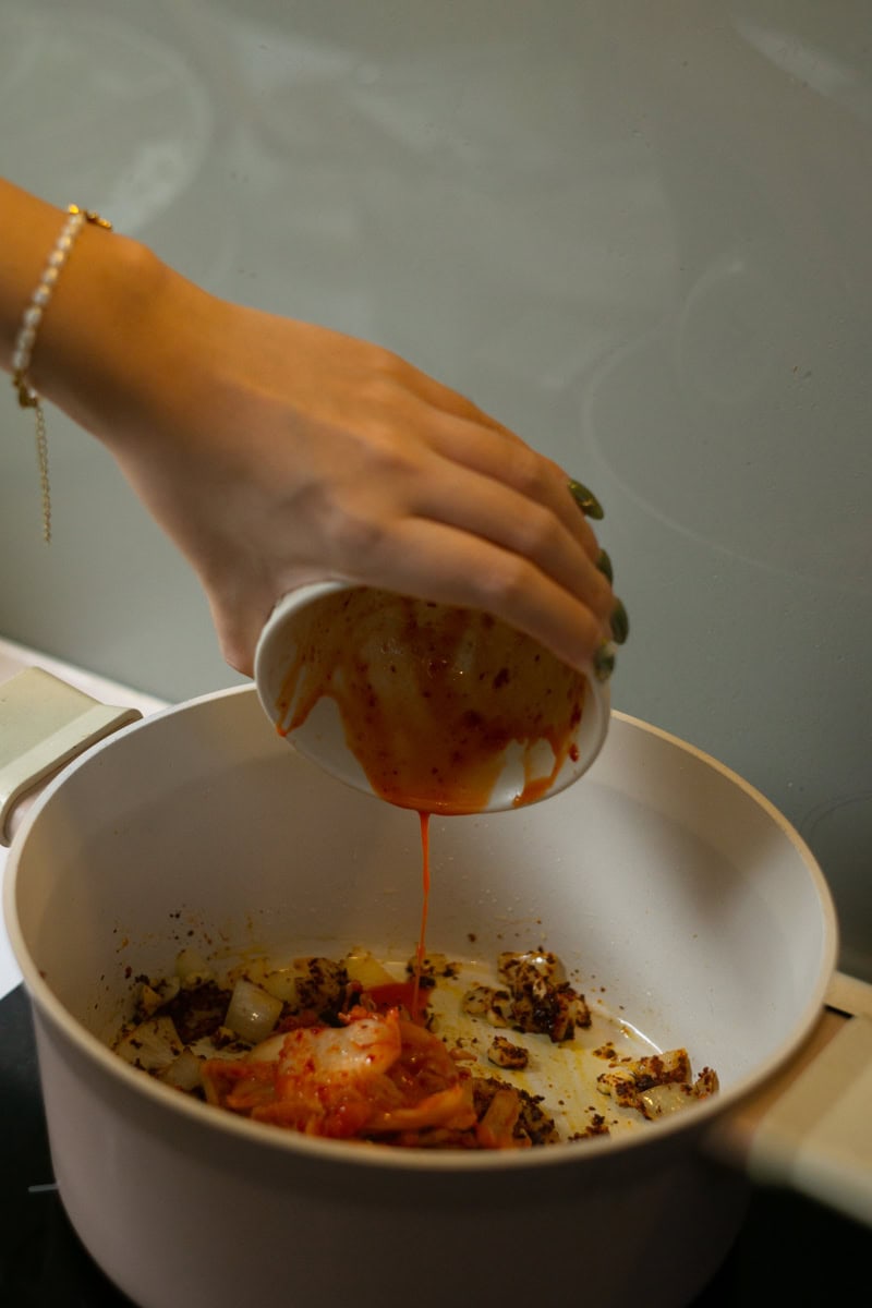 - Add kimchi, kimchi juice together with the gochujang and gochugaru and stir fry for 3-5 minutes.