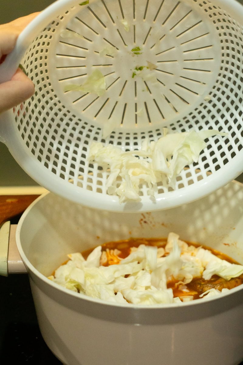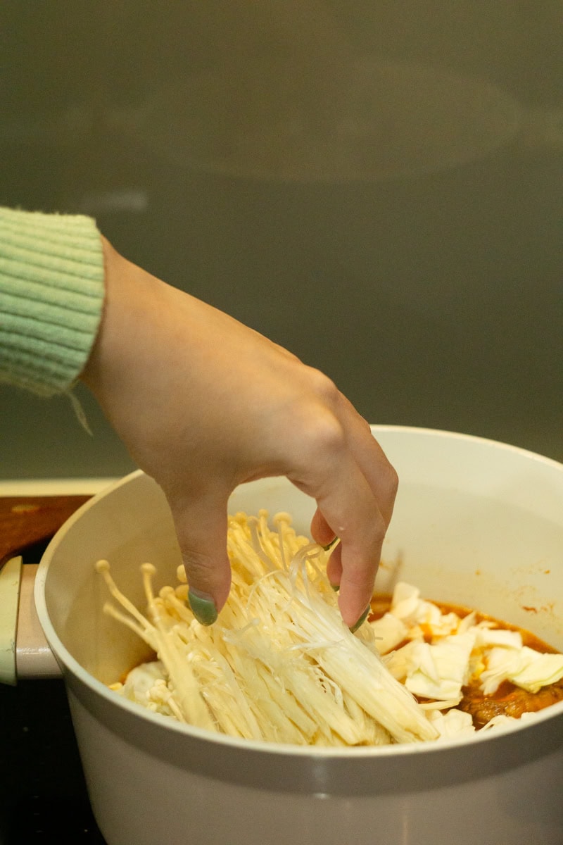 - Add the cabbage and enoki mushroom. Lower the heat and let it simmer for 7-10 minutes until everything is softened.