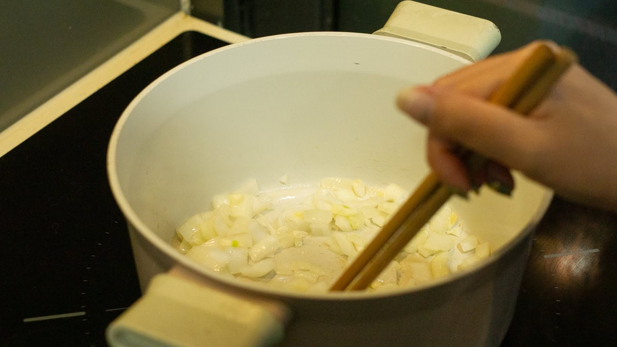 - Heat the pot with the cooking oil and sesame oil. Sauté minced garlic and onion for 1-2 minutes.