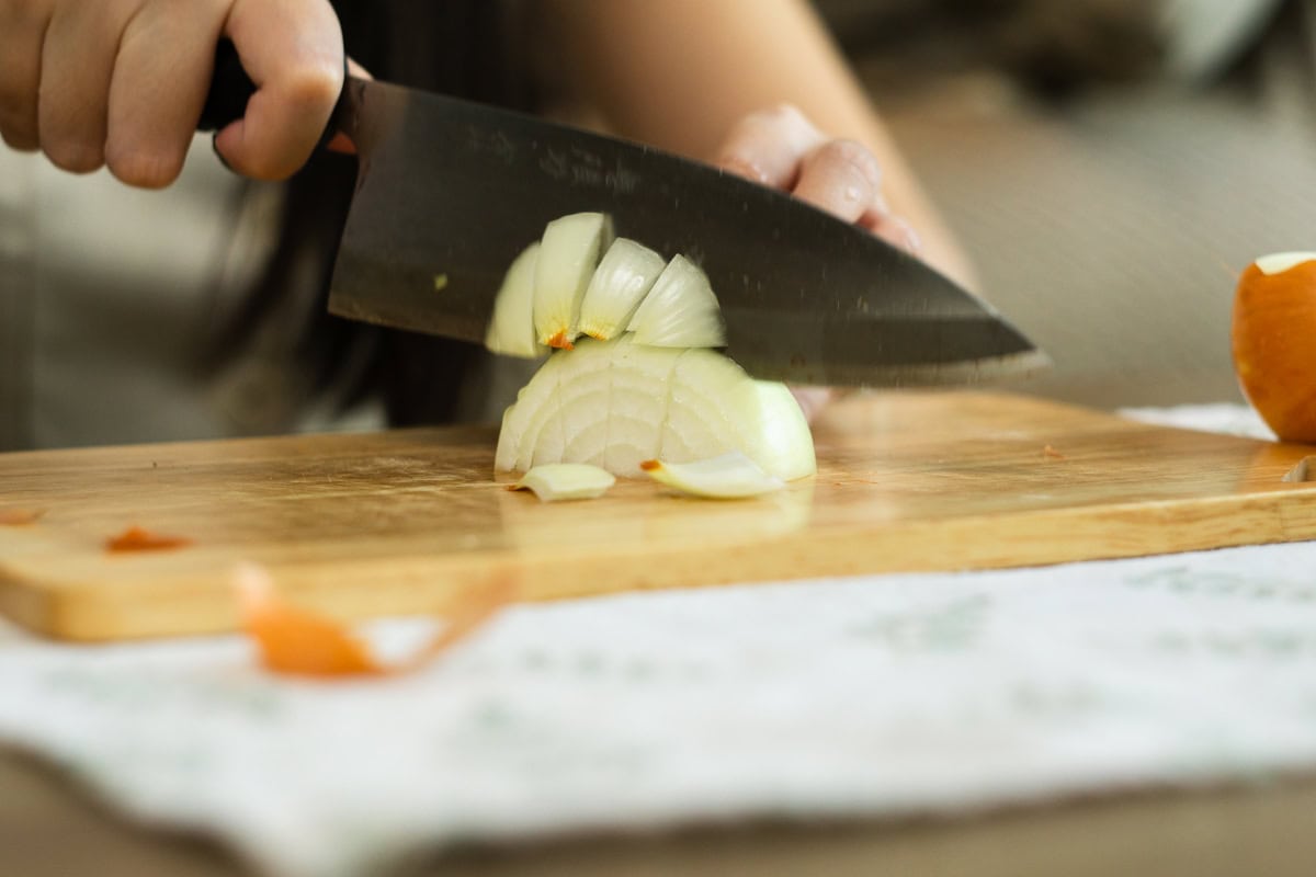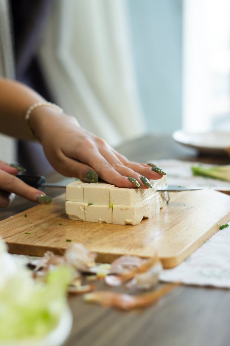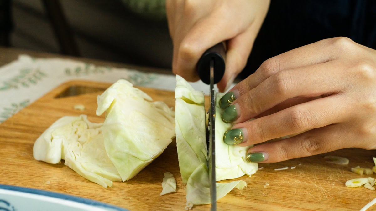 - Cut and prep the onion, garlic, cabbage, spring onion, and tofu. Cut the roots off the enoki mushrooms and separate into bunches.