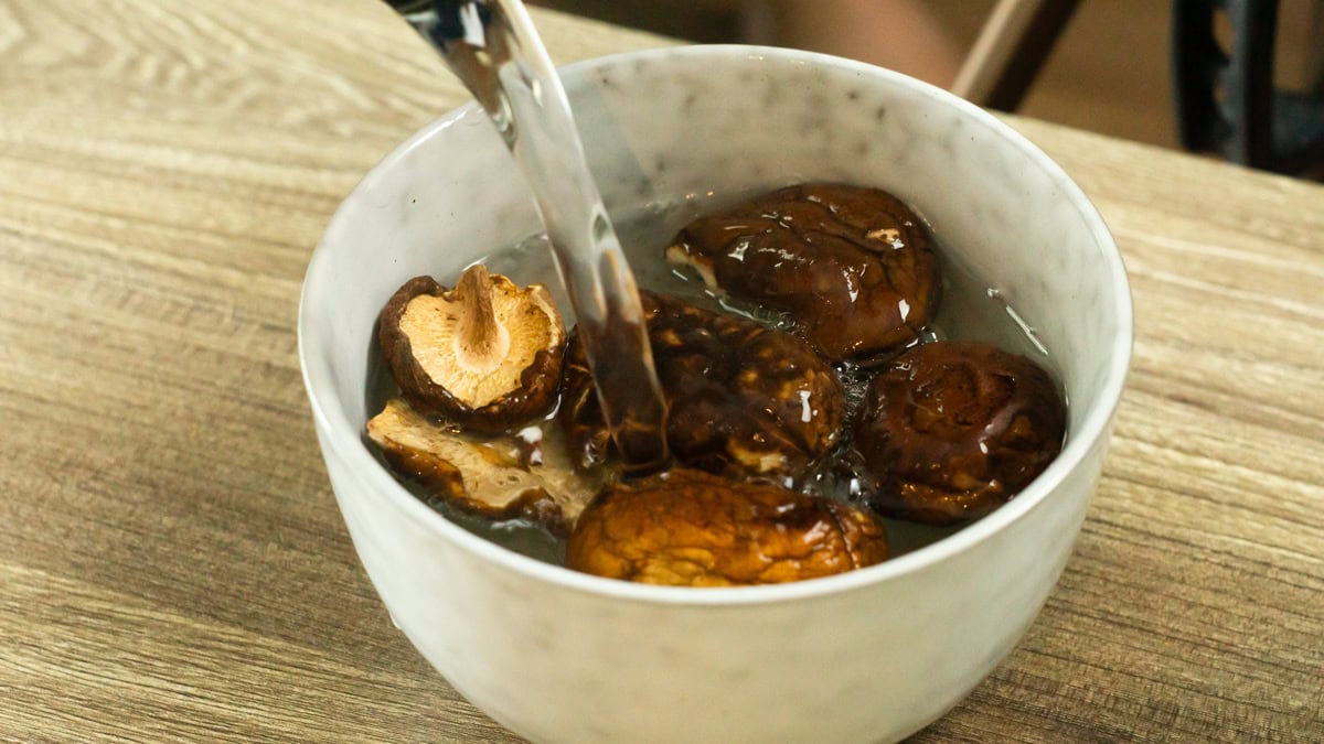 - Add hot water to dried shiitake mushrooms and let steep for at least 30 minutes. Preserve the stock water.