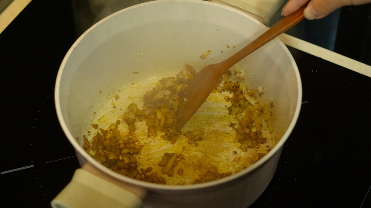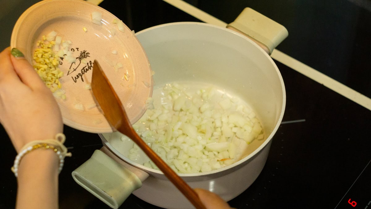 - Heat the pan and sauté the onion, then ginger and garlic with a pinch of salt until fragrant.
