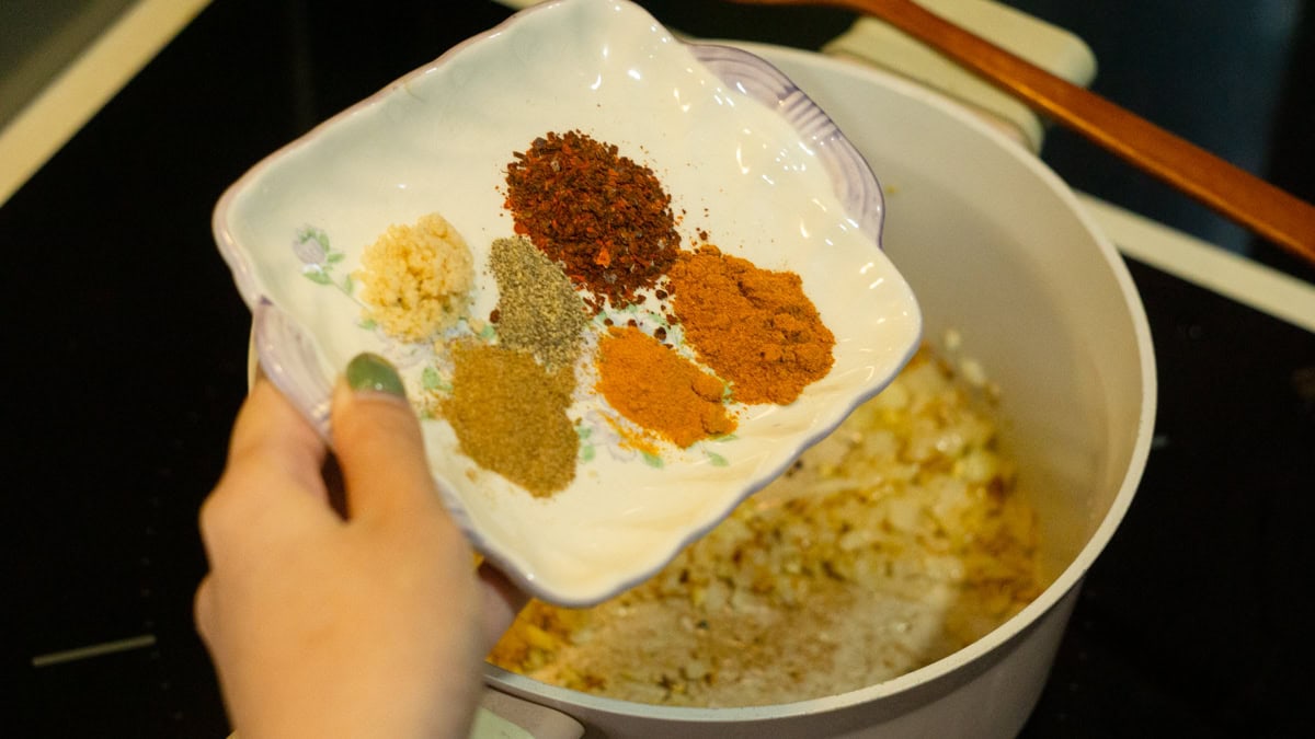 - Add the spices: curry, cumin, turmeric, paprika and toast for 30-60 seconds.