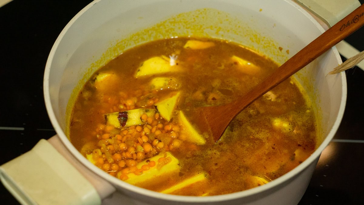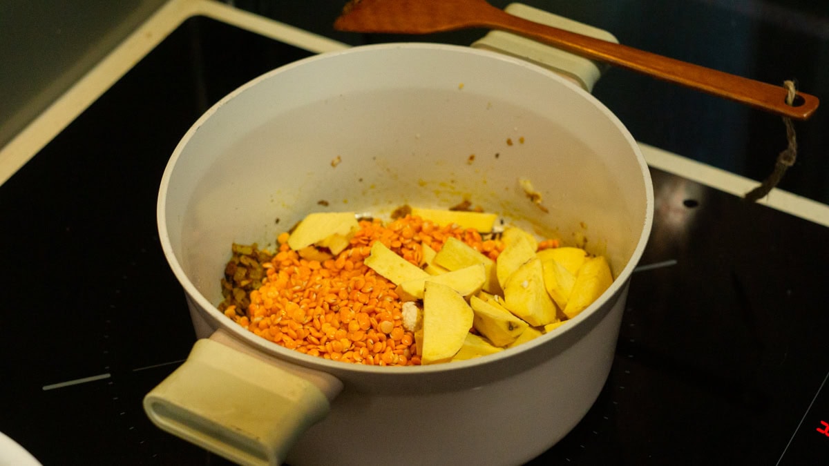 - Add sweet potato and lentils, then stir well so everything is coated.