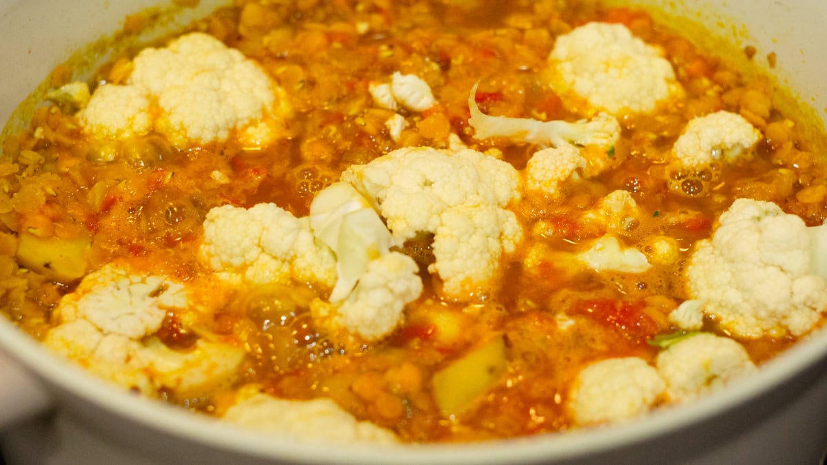 - Pour water/broth and tomato sauce and bring to a gentle boil. Then after 5 minutes, add the cauliflower florets. Let simmer for 15-20 minutes.