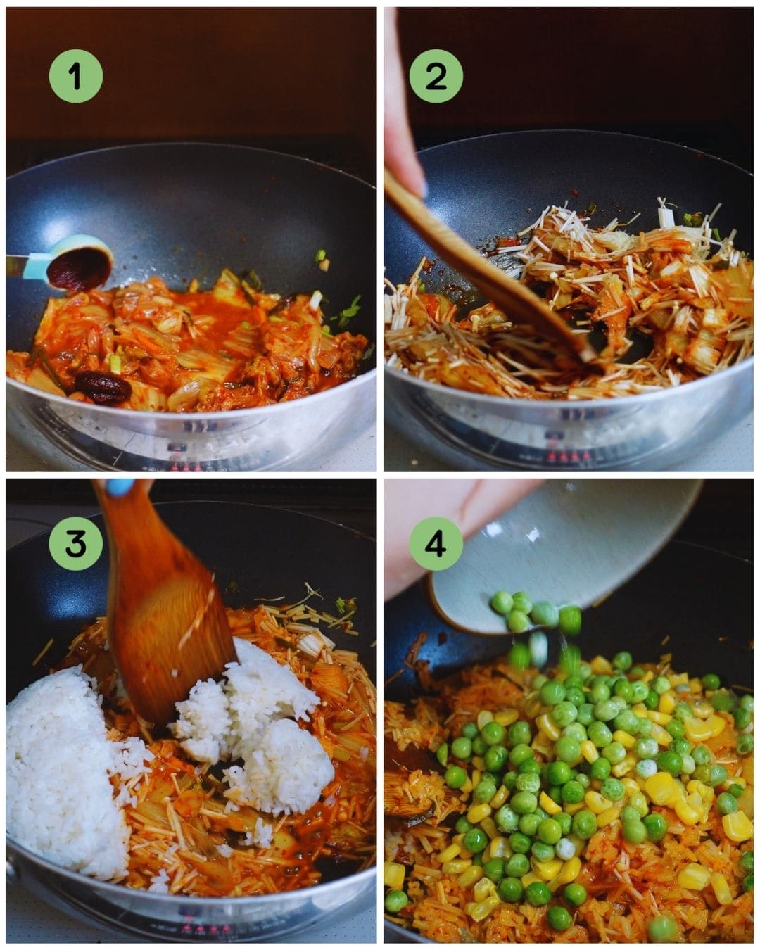 Heat oil in a pan and sautΓ© the white part of the scallions with kimchi and gochujang for 1 minute.